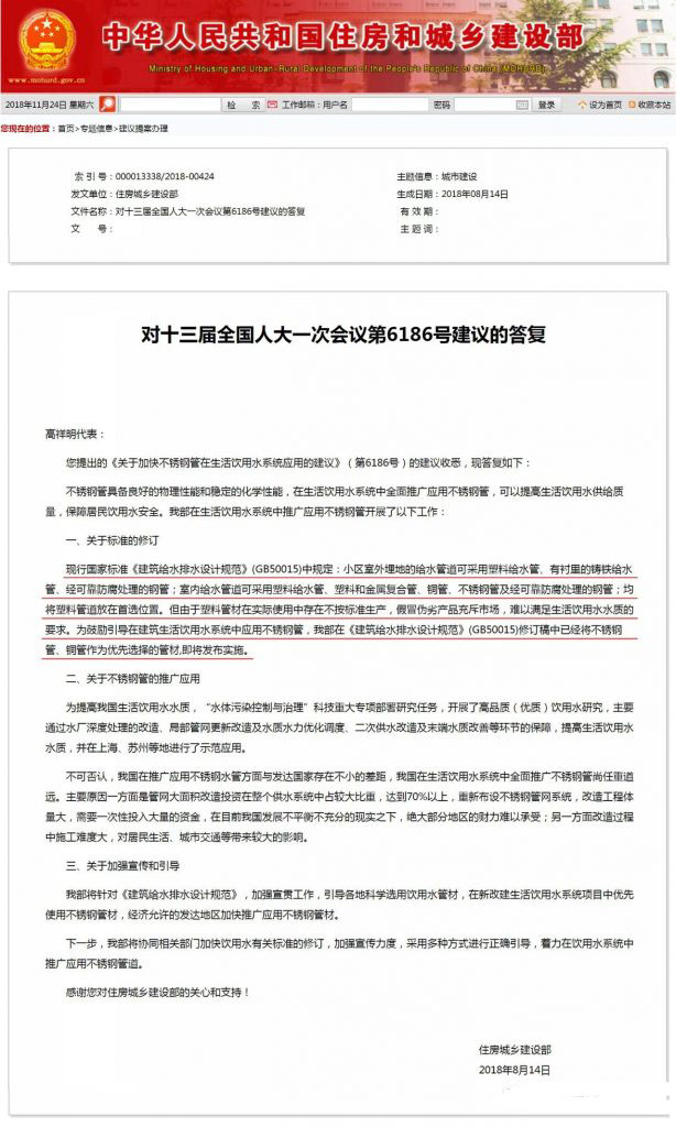 近年來,中央和地方加大了飲用水安全保障工作的力度,采取了一系列工程和管理措施。隨著人們生活水平的提高,家庭生活用水品質的提升首當其沖,而更耐用,更健康,更安全的家庭水管的出現就顯得尤為迫切。近日,國家住房城鄉建設部在《對十三屆全國人大一次會議第6186號建議的答復》中公開表態:為鼓勵引導在建筑生活飲用水系統中應用不銹鋼管,我部在《建筑給水排水設計規范》(GB50015)修訂稿中已經將不銹鋼管、銅管作為優先選擇的管材,即將發布實施。我部將針對《建筑給水排水設計規范》,加強宣貫工作,引導各地科學選用飲用水管材,在新改建生活飲用水系統項目中優先使用不銹鋼管材,經濟允許的發達地區加快推廣應用不銹鋼管材。下一步,我部將協同相關部門加快飲用水有關標準的修訂,加強宣傳力度,采用多種方式進行正確引導,著力在飲用水系統中推廣應用不銹鋼管道。