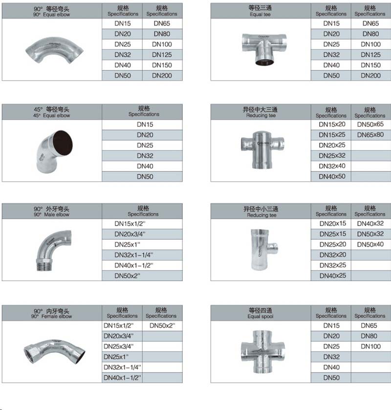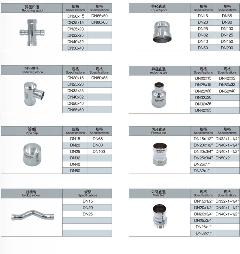 不銹鋼承插焊管件的品種包括:承插焊式45°等徑彎頭,承插焊式90°等徑彎頭,承插焊式180°等徑彎頭,承插焊式內(nèi)牙彎頭,承插焊式外牙彎頭,承插焊式異徑彎頭,承插焊式外牙三通,承插焊式內(nèi)牙三通,承插焊式等徑三通,承插焊式異徑中大三通,承插焊式異徑中小三通,承插焊式等徑四通,承插焊式異徑四通,承插焊式等徑直通,承插焊式異徑直通,承插焊式外牙直通,承插焊式內(nèi)牙直通,承插焊式過橋彎管,承插焊式管帽,承插焊式分水器等。